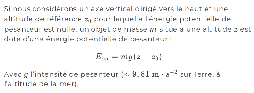 L’énergie potentielle de pesanteur est l’énergie mise en œuvre lors d’une interaction gravitationnelle.