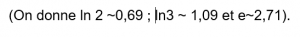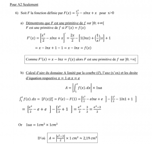 b- Calculer, en cm et à 10-2 près, l’aire A du domaine plan délimité par la courbe (C ), l’axe (x’Ox) et les droites d’équations x = 1 et x = e