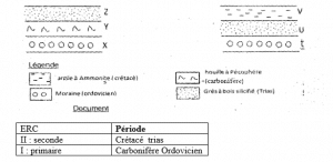 6) Donner la légende stratigraphique rangée par ordre chronologique des quatre couches, A quelles Erès géologiques appartiennent ces couches en utilisant un extrait d’une échelle stratigraphique.